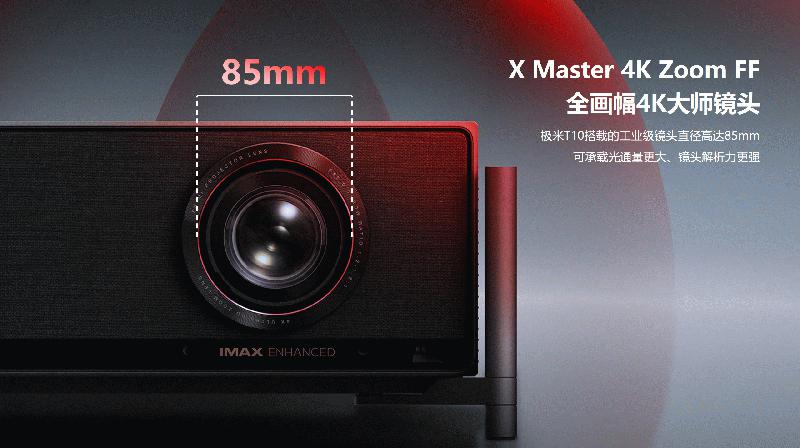 镜头方面,T10采用全链路自主研发的直径达85mm全画幅4K大师镜头,支持1.5倍光学变焦和双向光学移轴。在光学设计中,极米通过复杂的公式推导与软件、结构联动,确保在不同移轴条件下仍能保持高解析度,同时通过热补偿措施解决了高流明机器在高温环境下的失焦问题。同时,T10还解决了高亮度下的散热与防尘难题,让光路系统传输效率达到85%以上。