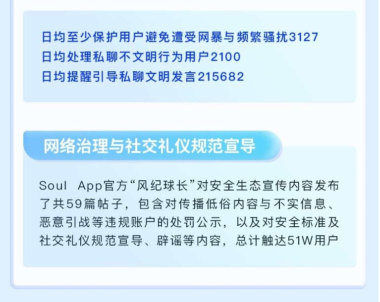 在“教育”维度,Soul App 持续投入资源,通过多渠道、多形式的宣传,增强用户对平台规则和网络文明规范的认知。官方账号“风纪球长”对安全生态宣传内容发布了59篇帖子,内容涵盖反低俗、反不实信息、反恶意引战、恶意盗用他人形象等违规行为的警示,以及对安全标准及社交礼仪规范的宣导,总计触达51万用户。这一系列教育举措显著提升了用户自我保护能力和文明互动素养。
