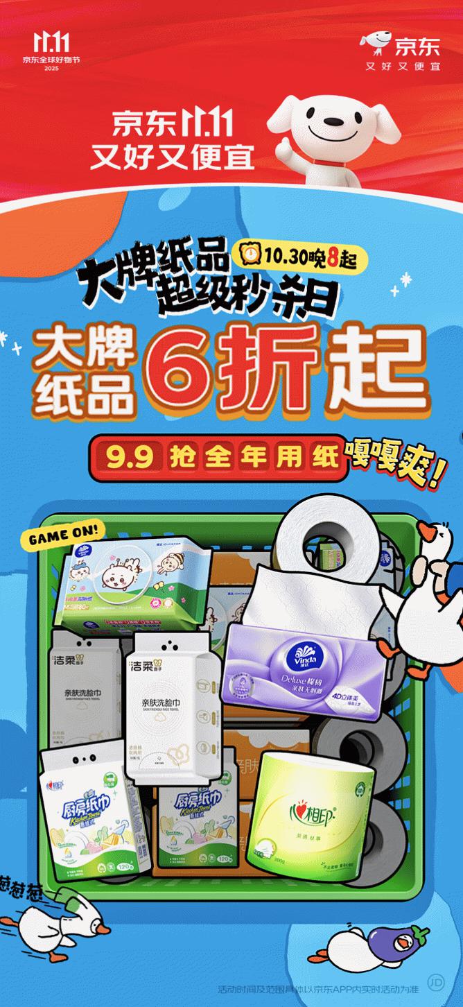 9.9元抢全年用纸!京东11.11大牌纸品超级秒杀日10月31日开启