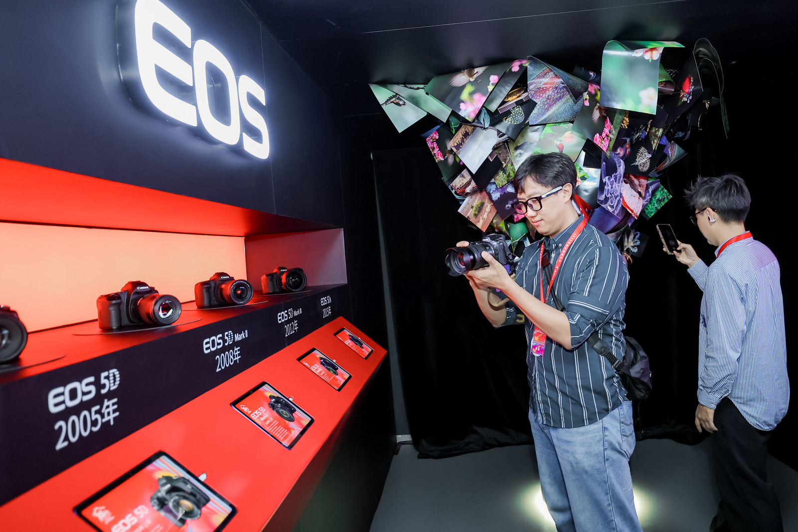 正值佳能EOS 5系数码相机诞生20周年之际,该系列8款产品也齐聚展览现场。此外,展览中央的“影像风暴”艺术装置以花束形式震撼呈现。数十幅承载着佳能EOS 5系数码相机20年发展历程的经典影像作品,以悬浮姿态在空中徐徐绽放,仿佛将20年影像技术的进化密码凝固成艺术结晶。