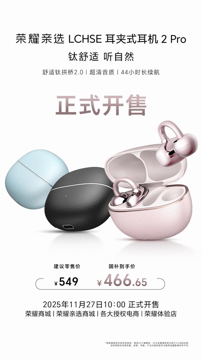 目前,荣耀耳夹耳机2 Pro已在11月27日10:00全渠道开售,共有典雅黑、玫瑰金、天青釉三款时尚配色可选,国补到手价466.65元。