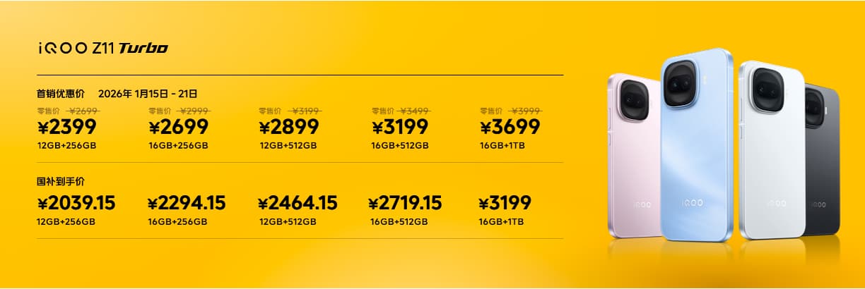 iQOO Z11 Turbo将于2026年1月15日正式开售,提供12GB+256GB、16GB+256GB、12GB+512GB、16GB+512GB、16GB+1TB五种存储版本,在1月15日~21日的首销期内下单,可享受300元官方优惠,叠加国补后累计最多立减800元,具体如下: